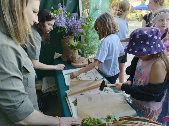 Eco printing – warsztaty ozdabiania bawełnianych worków techniką wykorzystującą naturalne barwniki z roślin cieszyły się ogromnym zainteresowaniem. Uczestnicy tworzyli unikatowe torby, ucząc się przy tym, jak przyroda może być źródłem nie tylko inspiracji, ale i kolorów!