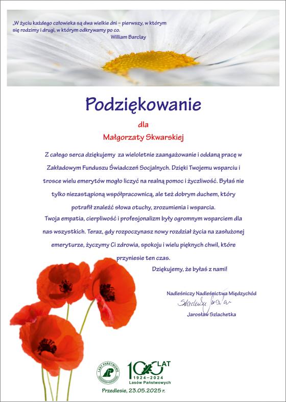 Spotkanie było okazją do rozmów, wspomnień, ale i refleksji. Wśród wielu serdecznych gestów szczególne miejsce zajęły podziękowania dla Pani Małgorzaty Skwarskiej – wieloletniej opiekunki emerytów, która sama właśnie żegna się z aktywnością zawodową. Jej zaangażowanie, serdeczność i niesłabnąca troska o dawnych współpracowników zasługują na najwyższe uznanie. To dzięki takim osobom, duch wspólnoty w Nadleśnictwie Międzychód pozostaje żywy i silny.