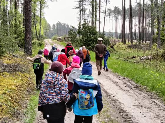 Spacer leśnika z dziećmi po lesie.
